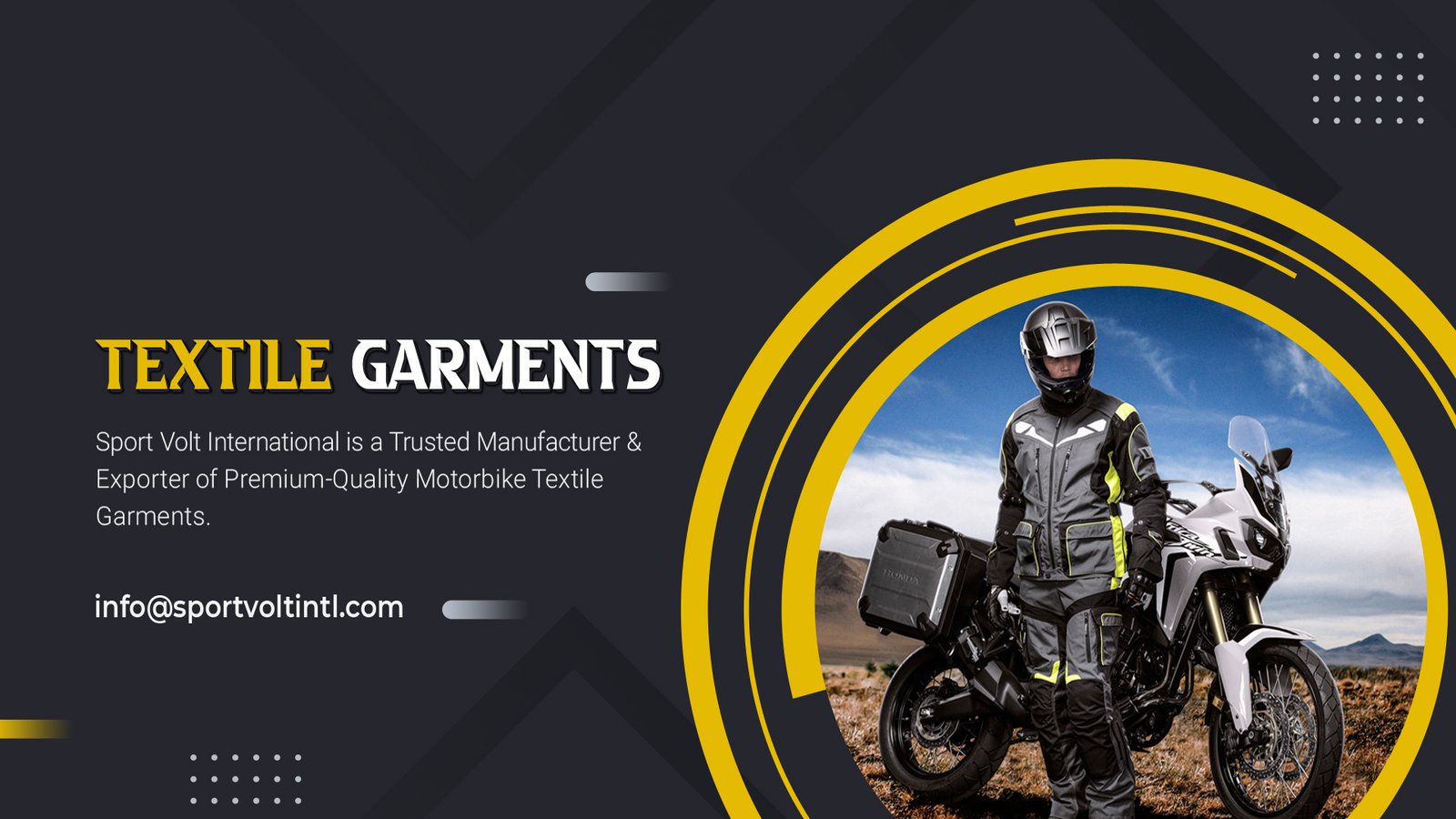 Sport Volt International is a trusted manufacturer and exporter of premium-quality Motorbike Leather Garments, Textile Garments, Boxing Equipment, Martial Arts, Gym Wear, Team Uniforms, Sportswear, and Gloves Collections. With a strong global presence, we take pride in delivering top-performing sports apparel and equipment designed for comfort, durability, and style.